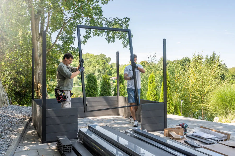 Der Aufbau dauert in der Regel einen halben bis einen ganzen Tag. Am besten arbeitet ihr zu zweit, besonders bei Wand- und Dachelementen. Dank vormontierter Module, Aluminiumrahmen und klarer Anleitung läuft der Aufbau strukturiert und stressfrei.